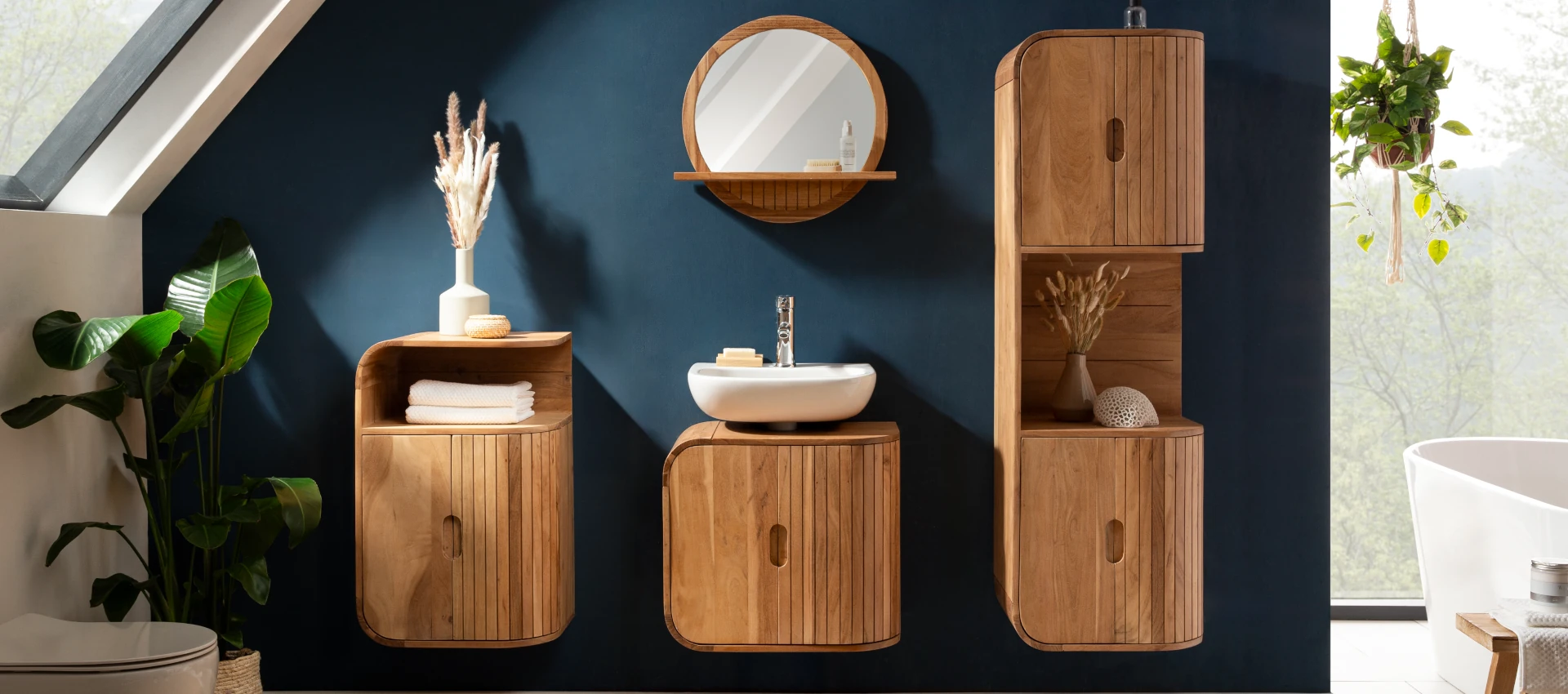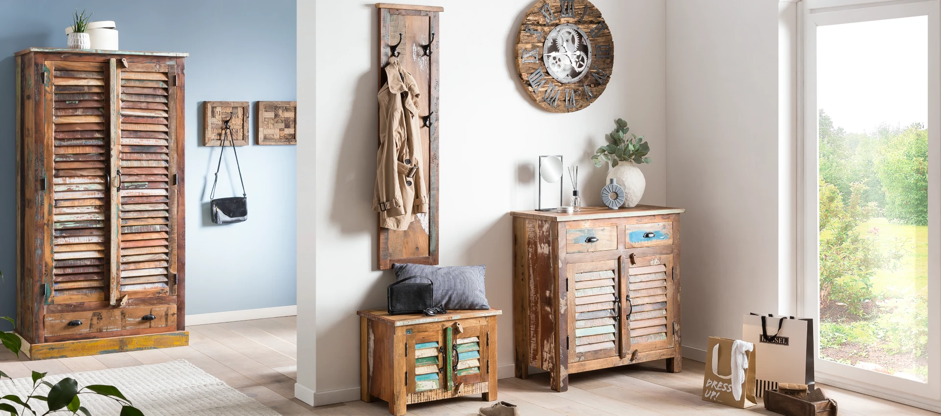 In unserem Onlineshop findest Du eine große Auswahl an Möbelserien aus Materialien wie Akazie, Pinie, Altholz und Mango. Für jeden Wohnraum ist das passende Stück dabei – zum Beispiel Couchtische aus Holz, Esstische massiv, Mango Schreibtisch, oder Bürotisch Holz. Auch bei Schränken bist du bei uns richtig: Entdecke Kleiderschrank Akazie, Fernsehschrank aus Holz, Highboards, Kommoden, Sideboard aus Massivholz, Echtholz Vitrinen. Du suchst ein neues Bett? Von Futonbett bis zum Himmelbett findest du bei uns alles - ob Betten mit Kopfteil oder massive Betten mit richtig Charakter. Besonders nachhaltig: unsere Möbel aus recyceltem Holz, etwa aus den Serien Wakefield, Madurai, Perth und Sumana. Weitere Highlights sind die Serien Chesterfield Echtleder, Bikes & Bars, Sydney, Sumatra, Cambridge, Delhi, Cancun und Osbon. Auch im Badezimmer bist du gut ausgestattet - mit Waschtischen aus Akazie, massiven Hochschränken und Unterschränke aus Holz. Für alle, die das Besondere lieben, lohnt sich ein Blick in die Kategorie Bikes & Bars: Hier findest du echte Unikate wie den Motorrad-Waschtisch, eine Telefonzellenbar, Marktwagen aus Echtholz, Couchtische im Fahrzeug-Design. Du willst gezielt nach Möbeln für deinen Wohnbereich stöbern? Dann klick dich durch unsere Wohnwelten Wohnzimmer, Badezimmer, Schlafzimmer, Büro und Flur um. Viel Spaß beim Entdecken!