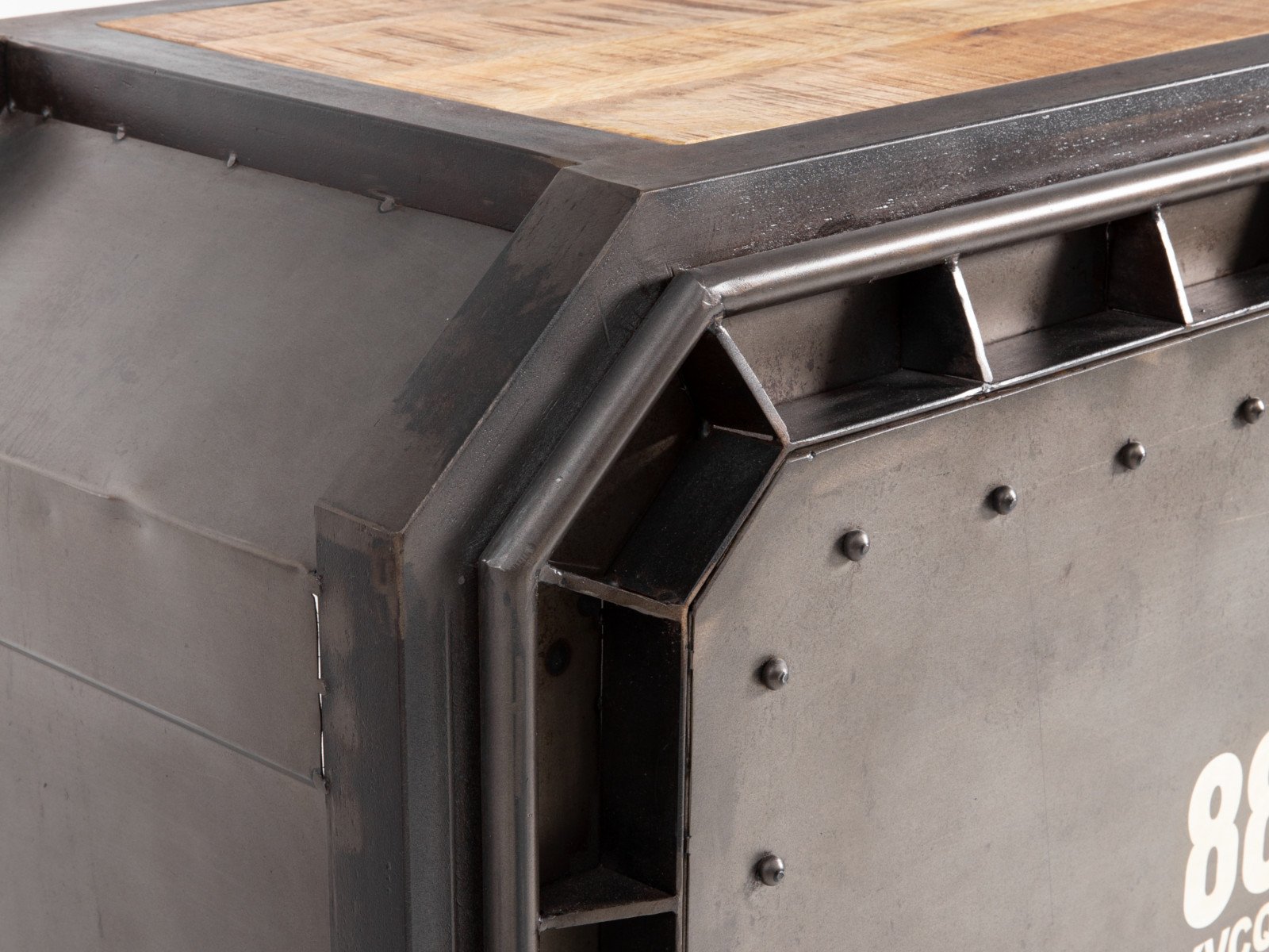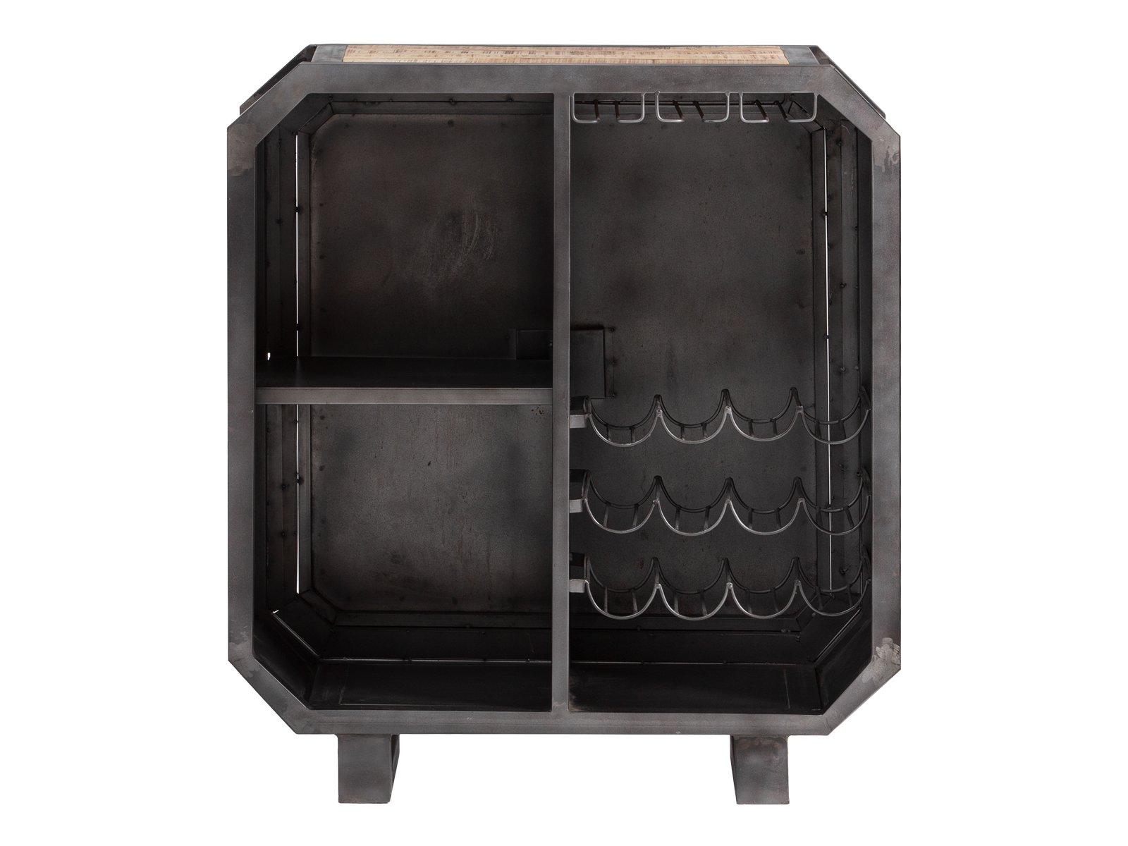 Der Bartresen punktet mit seiner rustikalen Ausstrahlung. Coole Aufdrucke geben ihm eine lässige Note und machen ihn zum Mittelpunkt jeder Party. Die Rückseite ist super praktisch: Hier finden 12 Flaschen in eigenen Fächern Platz, perfekt für Deine Lieblingsdrinks.